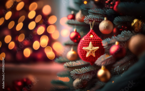 © YiuCheung, Fototapeta premium A close-up of a red crocheted Christmas ornament with a gold star hanging on a Christmas tree. The background is blurred with bokeh lights.