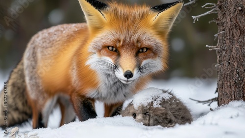 © Suphot, Obraz premium A close-up of a red fox exploring its snowy habitat, showcasing its vibrant fur and keen expression against a winter backdrop.