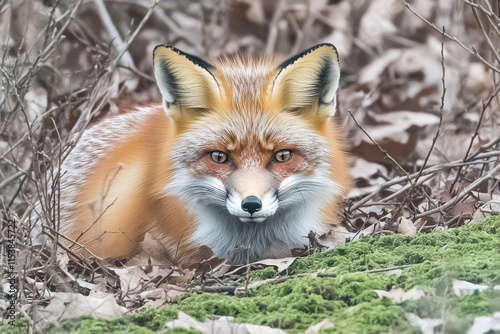 © Neneng, Fototapeta premium A close-up of a red fox resting among leaves and moss in a natural setting.