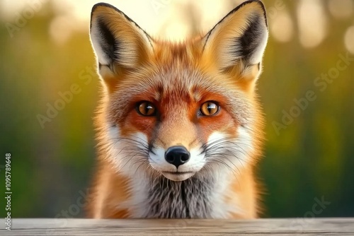 © Sanchai, Fototapeta premium A close-up of a red fox with its fur glowing in the golden light of sunset, staring intently at the viewer