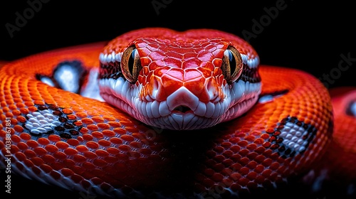 © Sonya, Obraz premium A close-up of a red snake's head, featuring black and white patterns on its body