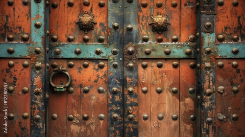 Fototapeta premium A close up of a rusty door with metal rivets and handles, AI
