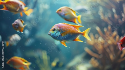 Naklejka premium A close-up of a school of fish swimming in a beautifully maintained aquarium.