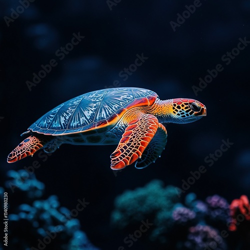 © Igor, Fototapeta premium A close-up of a sea turtle swimming in a body of water, surrounded by corals and other marine life