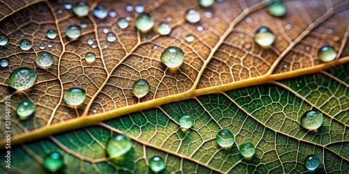 © Sayfar, Fototapeta premium A close-up of a single leaf, its veins visible, with dew drops glistening on the surface, leaf, nature, outdoors