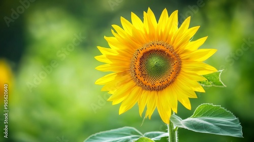 © Plaifah, Fototapeta premium A close-up of a single sunflower with vibrant yellow petals against a blurred green background, capturing the details of the flower's center.