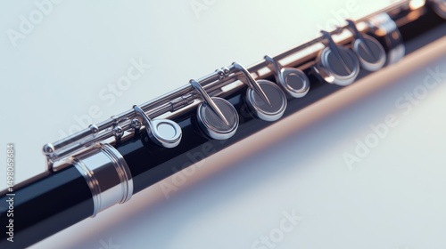 © Hijrah, Naklejka premium A close-up of a sleek, black flute highlighting its silver keys and smooth body.