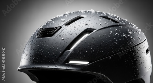 Fototapeta premium A close-up of a sleek black ski helmet with snow and condensation. Protective...