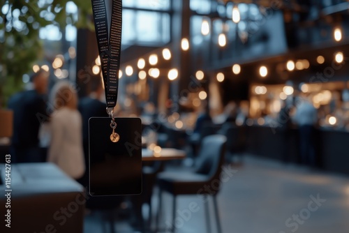 Naklejka premium A close-up of a sleek event badge hanging amidst a lively social atmosphere,...