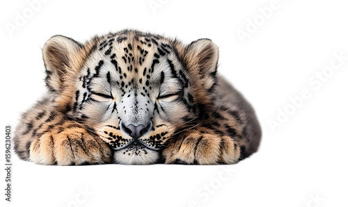 © Pixelbin, Obraz premium A close-up of a sleeping snow leopard cub with its eyes closed, resting its head on its paws against a white background.