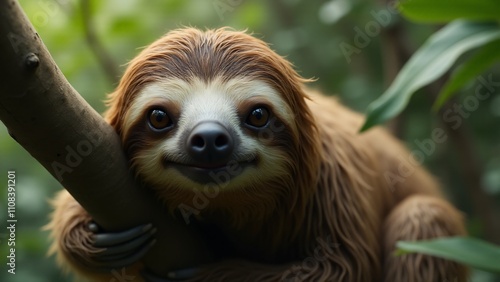 © Ernesto, Naklejka premium A close-up of a sloth hanging from a tree, with gentle eyes and shaggy fur. Soft sunlight highlights its calm, peaceful expression in a natural green jungle setting.