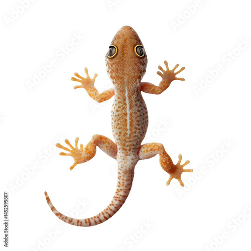 © Ouzhan, Naklejka premium A close-up of a small gecko with a white stripe down its back, looking at the camera. It has orange spots with brown and white stripes. The lizard's toes have small claws.