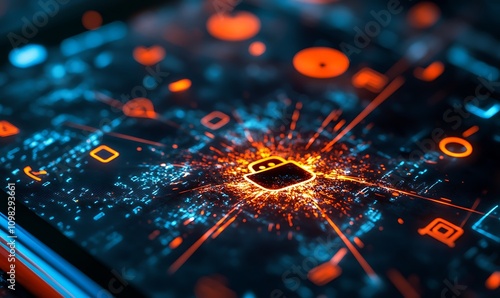 © Pumapala, Obraz premium A close-up of a smartphone screen displaying digital connections and a central chip.
