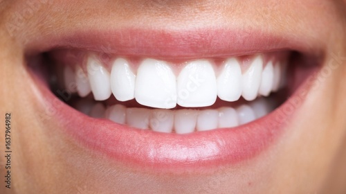 © Lew, Fototapeta premium A close-up of a smiling mouth with perfectly aligned white teeth,