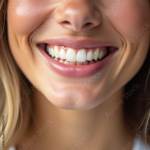 © Makaron, Fototapeta premium A close-up of a smiling woman showcasing bright, healthy teeth, perfect for dental, health, beauty, and lifestyle promotions.