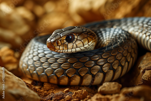 © Edge of Art , Fototapeta premium a close up of a snake on a branch with a blurry background.