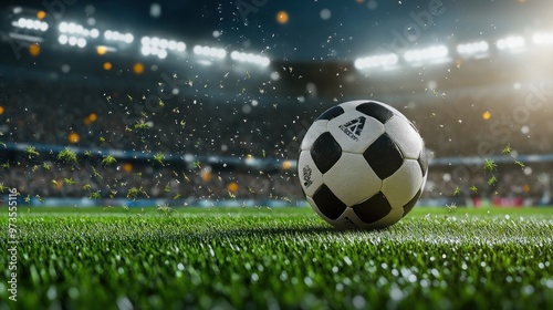 Fototapeta premium A close-up of a soccer ball on a grass field with a stadium backdrop.