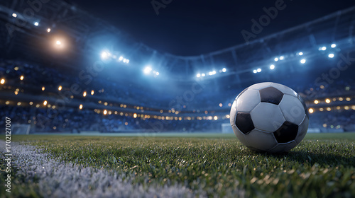 © Anita, Obraz premium A close-up of a soccer ball on a vibrant field during a night match with stadium lights illuminating