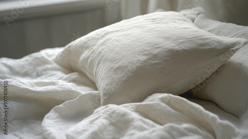 Obraz premium a close-up of a soft white pillow resting on off-white bed linens