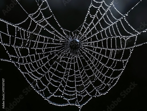 © DudeDesignStudio, Naklejka premium A close-up of a spider web adorned with dew droplets against a dark background.