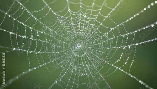 © Monster, Naklejka premium A close-up of a spider web covered in water droplets against a soft green background.