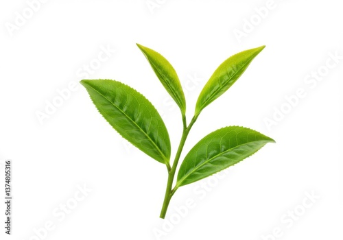 © Sarwar, Fototapeta premium A close up of a sprig of bright green tea leaves on a stark white background in sharp focus detail
