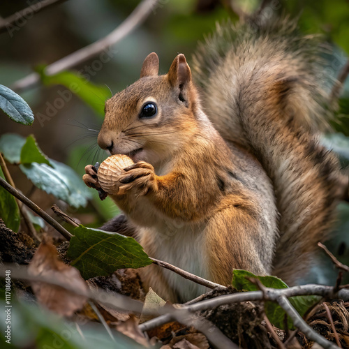 Fototapeta premium A close-up of a squirrel eating food, showcasing its delicate paws, fluffy tail