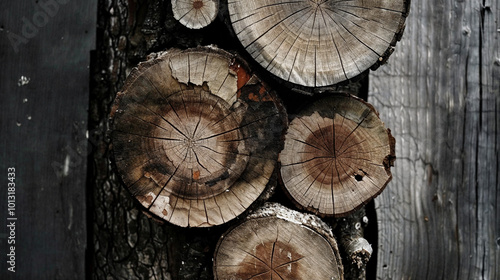 Naklejka premium A close-up of a stack of wooden tree trunks. The trunks have a weathered...
