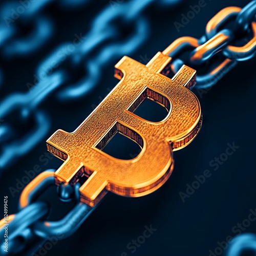 © MetaKibo, Obraz premium A close-up of a stylized Bitcoin symbol on a chain background.