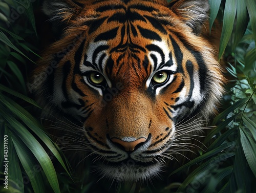 Naklejka premium A close-up of a tiger's face amidst lush green foliage, highlighting its...