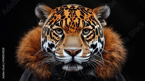 © Alice, Fototapeta premium A close-up of a tiger's face, featuring fur on its head against a black backdrop