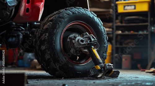 © afridwi, Fototapeta premium A close-up of a tire with a tool resting against it in a workshop setting.