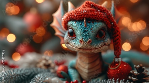 © Albert, Fototapeta premium a close up of a toy dragon wearing a knitted hat and holding a christmas ornament in front of a christmas tree with lights and a blurry background.