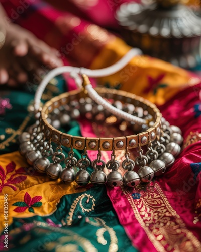 Fototapeta premium A close-up of a traditional Indian silver anklet, or payal, with dangling bells, resting on a vibrant, embroidered silk saree. A cultural and festive accessory.