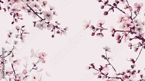 © Anna, Fototapeta premium A close-up of a tree branch adorned with pink blossoms on a pastel pink backdrop with space for text