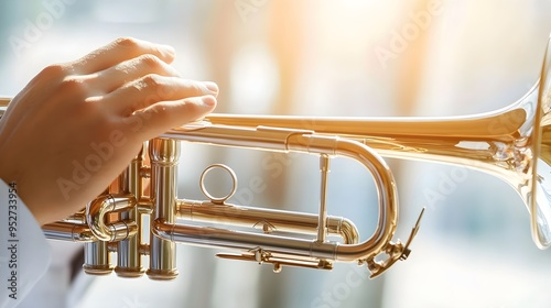 Obraz premium A close-up of a trumpeter's hands expertly maneuvering the valves of a trumpet, set against a soft, light backdrop