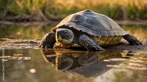 Fototapeta premium A close-up of a turtle basking by a calm water body, showcasing its beautiful...