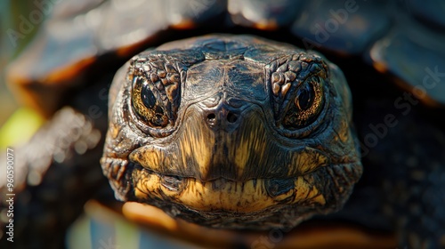 © phattharabodin, Obraz premium A close-up of a turtle face, with its wise, ancient eyes and textured skin clearly visible, against a blurred natural background.