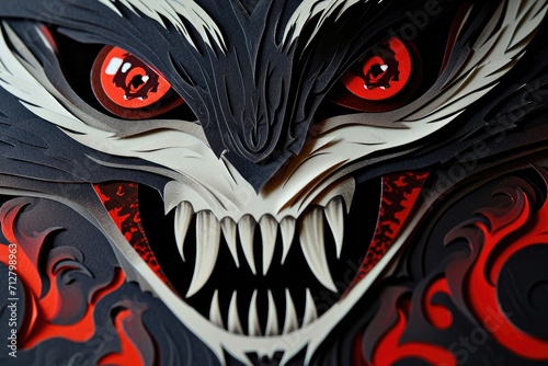 © PinkiePie, Obraz premium A close-up of a vampire face with sharp fangs and blood red eyes Halloween art design vampire fangs