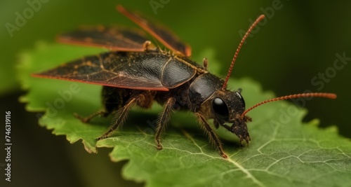 Fototapeta premium A close-up of a vibrant red and black beetle on a leafy green background