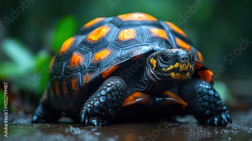 © Edo, Fototapeta premium A close-up of a vibrant tortoise in a lush, rainy environment.