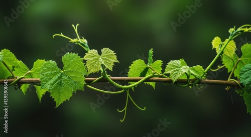 © all is well, Obraz premium A close up of a vine with green leaves winding along a branch against a blurred green background outdoors