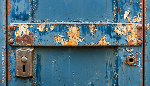 Naklejka premium A close-up of a weathered blue door with rust and peeling paint, featuring a lock and keyhole, suggesting age and neglect.