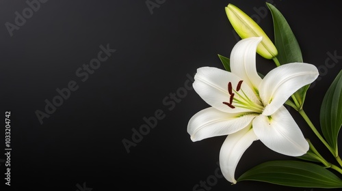© tinnakorn, Fototapeta premium A close-up of a white lily flower with a green bud against a dark background.