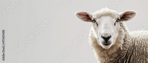 Fototapeta premium A close-up of a white sheep against a plain background, emphasizing its curly...