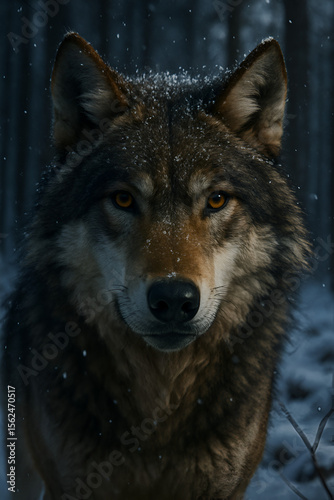 © Martin, Obraz premium A close-up of a wolf’s face in a snowy forest