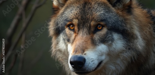 © Ilona, Obraz premium A close up of a wolf's face with yellow eyes