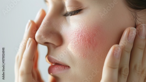 © IMRAN, Obraz premium A close-up of a woman gently touching her nose with a noticeable red spot, emphasizing skincare, sensitivity, or health concerns in a clean and minimalistic background.