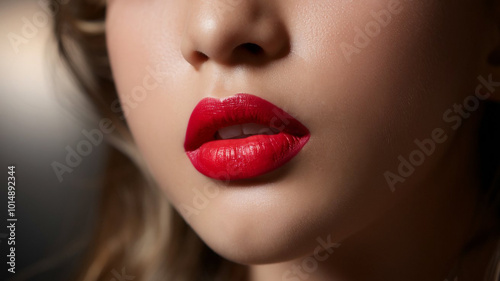 Fototapeta premium A close-up of a woman's attractive lips with red lipstick.