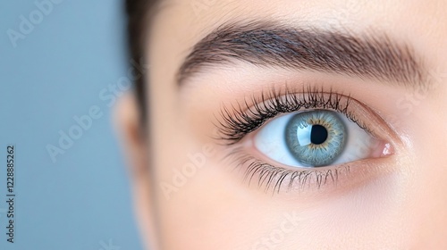 © Jiraphat, Obraz premium A close-up of a woman's eye featuring a striking blue iris, long eyelashes, and well-groomed brows against a soft, blurred background.